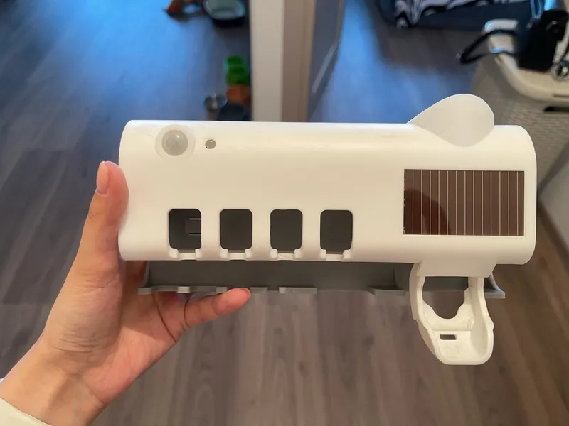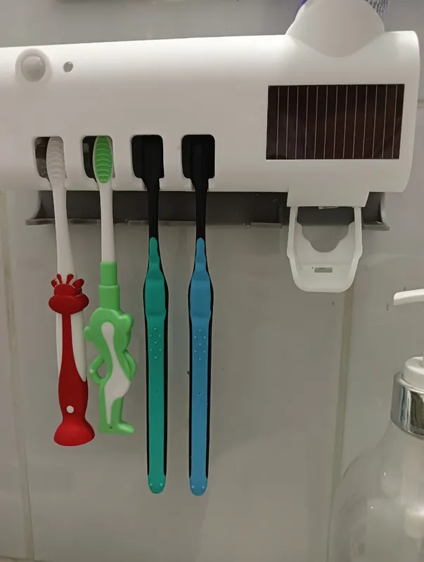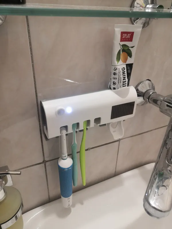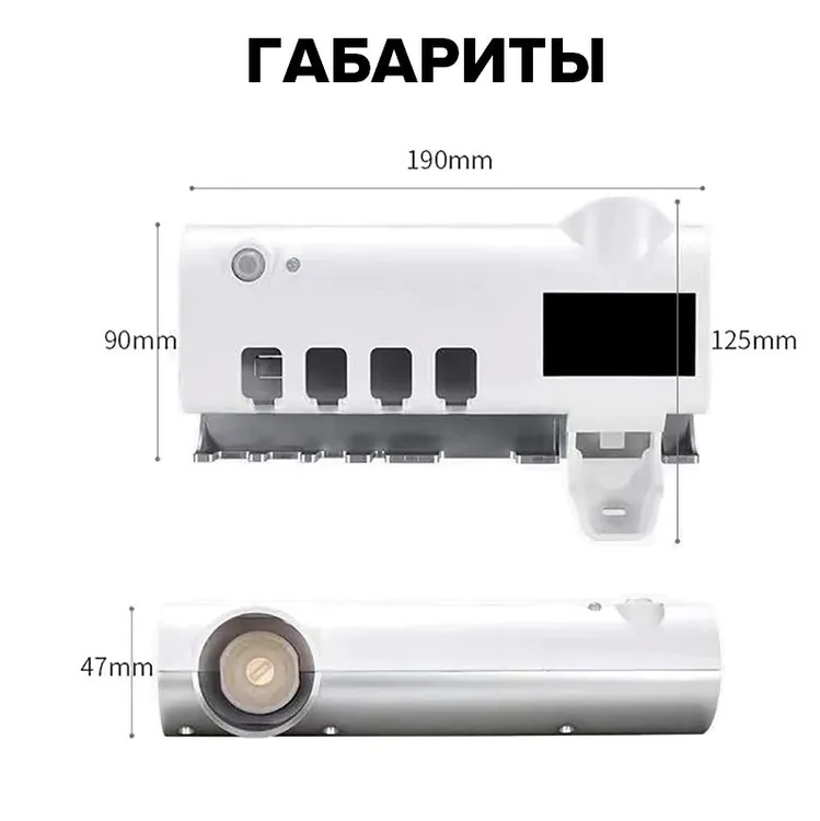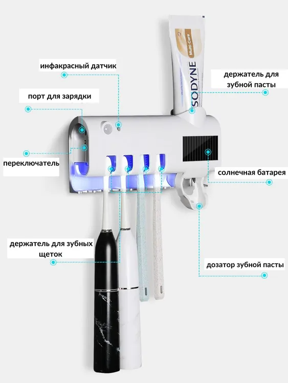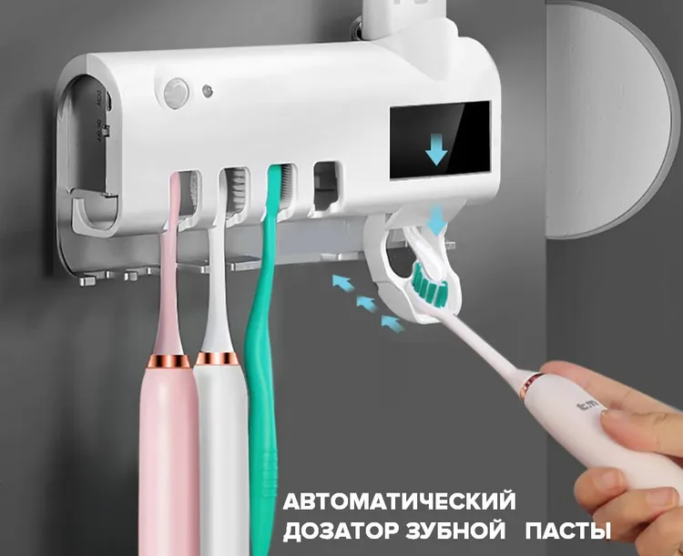 Держатель оснащен датчиком автоматического включения. Как только вы отходите на расстояние 1 м включается УФ дезинфекция. И также отключается при наличии рядом движения. Дезинфекция проводится с помощью ультрафиолета и убивает до 99% микробов и бактерий. Встроенный дозатор контролирует равномерную подачу зубной пасты, тем самым экономит ее расход. Вам только потребуется вставить тюбик с зубной пастой в специальный отсек. Держатель имеет 4 отделения для зубных щеток, в которые помещаются как обычные, так детские и электрические. Также имеются отделения для бритвенных станков.